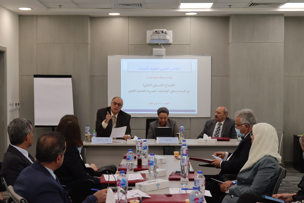 نظم المجلس القومي لحقوق الإنسان لجنة نشر ثقافة حقوق الإنسان، الاجتماع التنسيقي الثاني مع ممثلي الجامعات الحكومية والغير حكومية بالقاهرة الكبرى، لمناقشة أطر التعاون لإعداد وتنفيذ برامج التثقيف والتوعية بحقوق الإنسان، بحضور السفيرة الدكتورة مشيرة خطاب رئيسة المجلس، والسفير الدكتور محمود كارم نائب رئيس المجلس، والأستاذة نهاد أبو القمصان، عضو المجلس ورئيسة لجنة نشر ثقافة حقوق الإنسان، والدكتور إسماعيل عبد الرحمن عضو المجلس ورئيس وحدة التدريب.