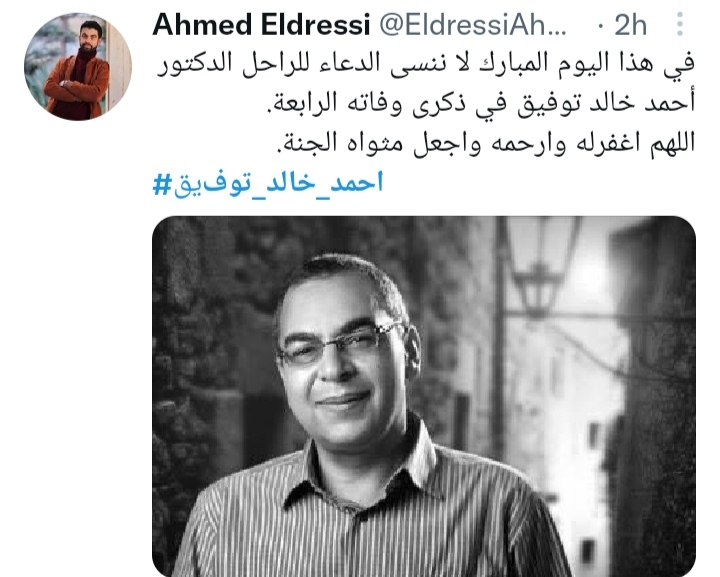 ورثاه الكاتب أحمد الإدريسي في تغريدة له على موقع التواصل الاجتماعي تويتر قائلًا: في هذا اليوم المبارك، لا ننسي الدكتور أحمد خالد توفيق في ذكرى وفاته الرابعة، اللهم اغفر له وارحمه واجعل مثواه الجنة.