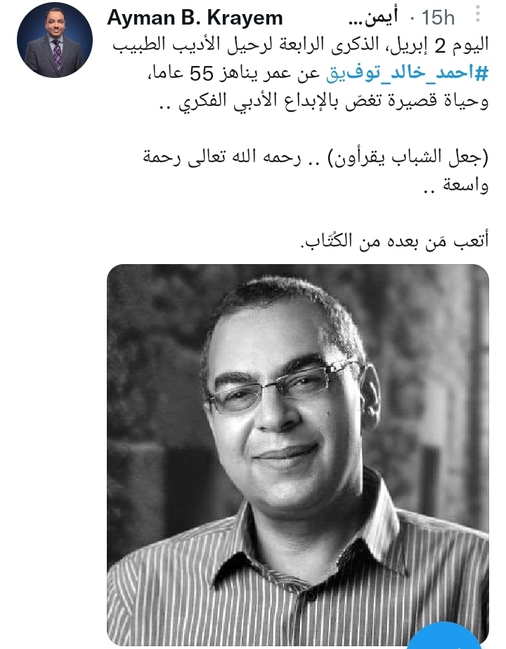 ونشر الكاتب أحمد بدر كريم على حسابه الشخصي بموقع التواصل الاجتماعي تويتر تغريدة يقول فيها: اليوم 2 أبريل، الذكرى الرابعة لرحيل الطبيب الأديب أحمد خالد توفيق عن عمر يناهز الـ 55 عامًا، وحياة قصيرة تغص بالإبداع الأدبي الفكري، جعل الشباب يقرأون.. رحمه الله رحمة واسعة، أتعب من بعده الكتاب.
