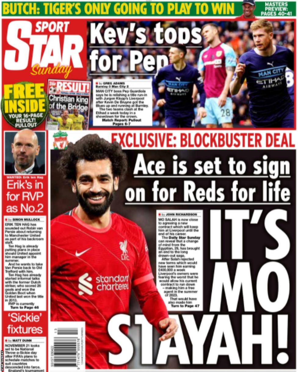تصدر محمد صلاح؛ غلاف صحيفة ديلي ستار لعدد اليوم، وذلك بعد أن عنونت الصحيفة بـ بقاء محمد صلاح، وقالت إن الفرعون المصري سوف يتقاضى راتبًا بقيمة 400 ألف جنيه إسترليني أسبوعيا، للاستمرار مع الريدز والاعتزال في آنفيلد.