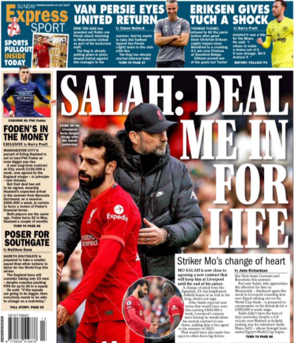 قالت إكسبريس في غلافها اليوم، إن محمد صلاح سوف يستمر رفقة ليفربول بعقد جديد مدى الحياة، بعد أن قرر اللاعب؛ تمديد عقده وتخفيض مطالبه المالية.