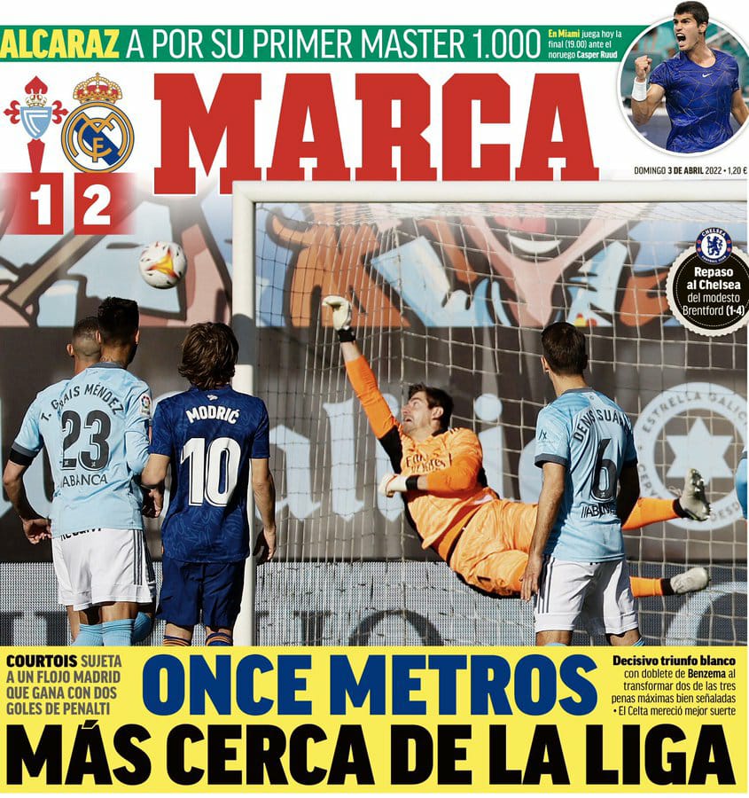 أشادت ماركا في غلافها اليوم، بالنجم البلجيكي تيبو كورتوا، حارس فريق ريال مدريد بأدائه أمام سيلتا فيجو، وذلك تحت عنوان يُغطي كورتوا ضعف الفربقح الذي فاز بهدفين من بنزيما من ركلات الجزاء،.