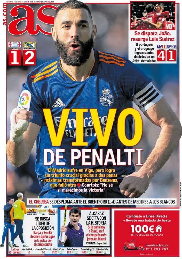 تصدّر كريم بنزيما، قائد وهداف فريق ريال مدريد غلاف صحيفة آس الإسبانية، بعد تألقه بهدفين ضد سيلتا فيجو أمس، حيث قالت الصحيفة إن بنزيما؛ عاد من إصابته بهدفين من ركلة جزاء.