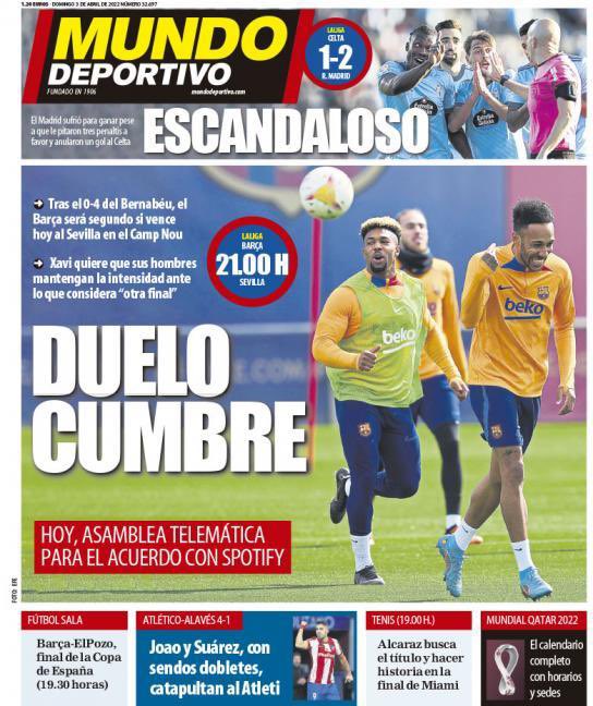 سلطت موندو ديبورتيفو؛ الضوء في غلافها على مواجهة برشلونة وإشبيلية اليوم، حيث عنونت بـ القمة المزدوجة، موضحة أنه بعد فوز الكتالوني 0-4 في البرنابيو؛ سيحتّل برشلونة المركز الثاني إذا فاز اليوم على إشبيلية في كامب نو.