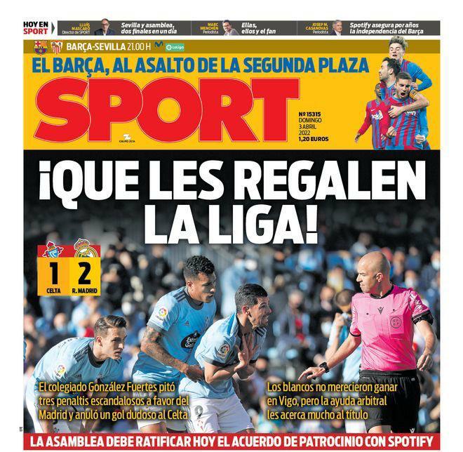 هاجمت سبورت؛ حكم مباراة ريال مدريد وسيلتا فيجو أمس، بعد احتسابه 3 ركلات جزاء لمدريد في نفس لقاء أمس، والذي أثار جدلًا كبيرًا، كما عنونت سبورت في غلافها بـ أعطوهم الليجا، وقالت إن ريال مدريد لم يستحق الفوز في فيجو، لكن مساعدة الحكم تقربهم كثيرًا من اللقب.