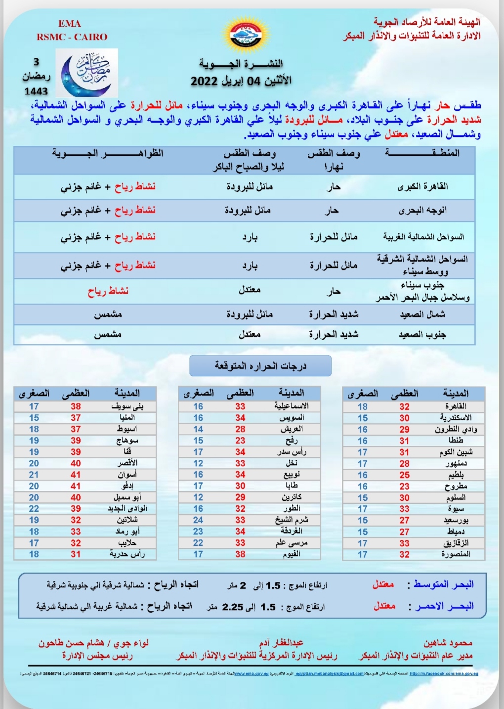 وقالت الهيئة العامة للأرصاد الجوية، إنه يسود غدا الاثنين الموافق ثالث أيام شهر رمضان المبارك، طقس حار نهارًا على القاهرة الكبرى والوجه البحري وجنوب سيناء، مائل للحرارة على السواحل الشمالية يكون شديد الحرارة على جنوب الصعيد.