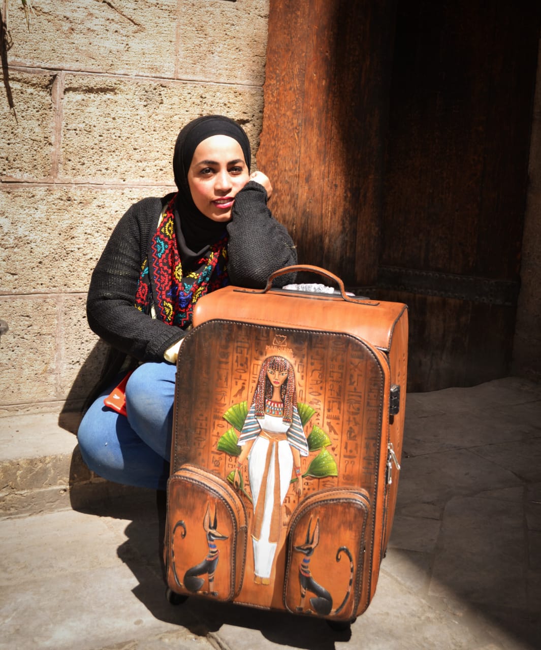 وواصلت: تعلمتُ النحت والرسم على الجلود، وبالفعل أنتجتُ حقائب سفر كبرى من الجلود، منحوت عليها فنون من الحضارة الفرعونية، مشيرة إلى شراءها للأدوات المستخدمة تدريجيًا.