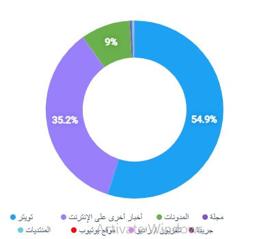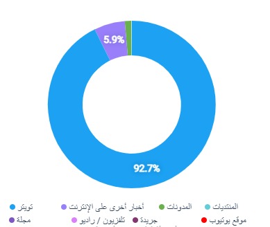 وكان تويتر هو الأعلى في حصد التفاعل حيث وصلت نسبة التفاعل عليه إلى 92.8%، يليه الأخبار على الإنترنت بنسبة 5.9%، تليها المدونات بنسبة 1.2%، وفقًا لأداة Talkwalker.