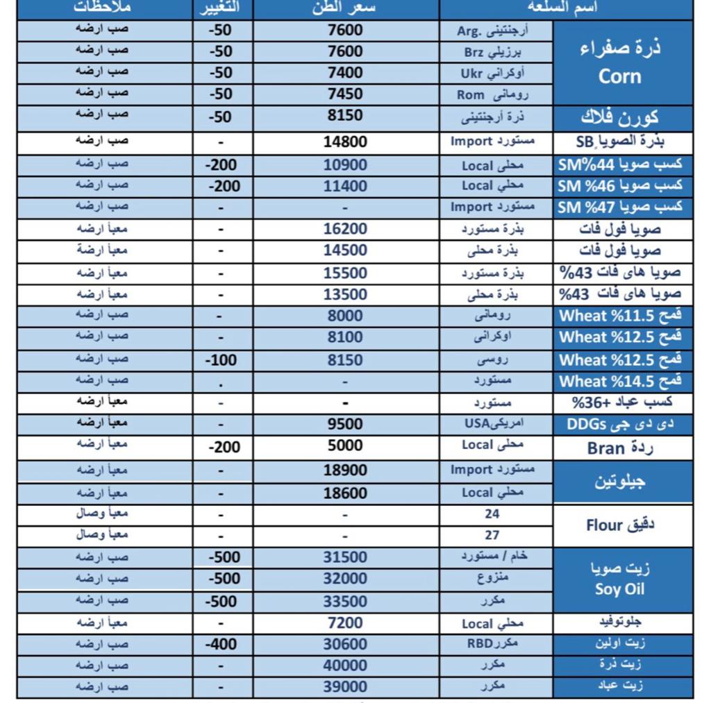 وخسر اليوم سعر طن الردة المحلي نحو 200 جنيه، ليسجل نحو 5000 جنيه مقابل 5200 جنيه، كما تراجع سعر طن القمح الروسي، ليسجل نحو 8150 جنيها، وبلغ سعر طن كسب الصويا المحلي نحو 10900 جنيه.