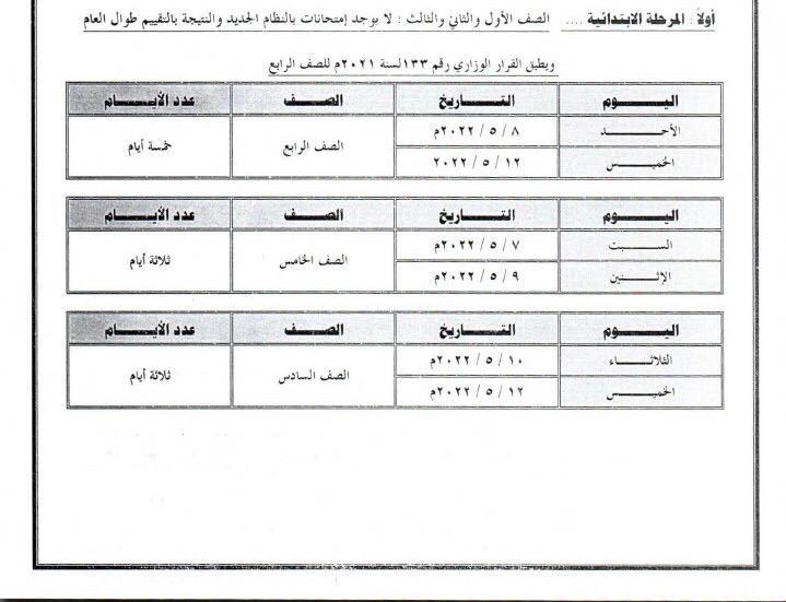 بالنسبة للصف الأول والثاني والثالث الابتدائي، فإن التقييم مستمر طوال العام، ولا توجد امتحانات بالنظام الجديد، أما الصف الرابع الابتدائي تستمر الامتحانات لمدة 5 أيام، وتبدأ يوم 8 مايو المقبل حتى 12 مايو، والصف الخامس الابتدائي لمدة 3 أيام، وتبدأ من 7 مايو لـ 9 مايو، والصف السادس الابتدائي لمدة 3 أيام، وتبدأ 10 مايو حتى 12 مايو.