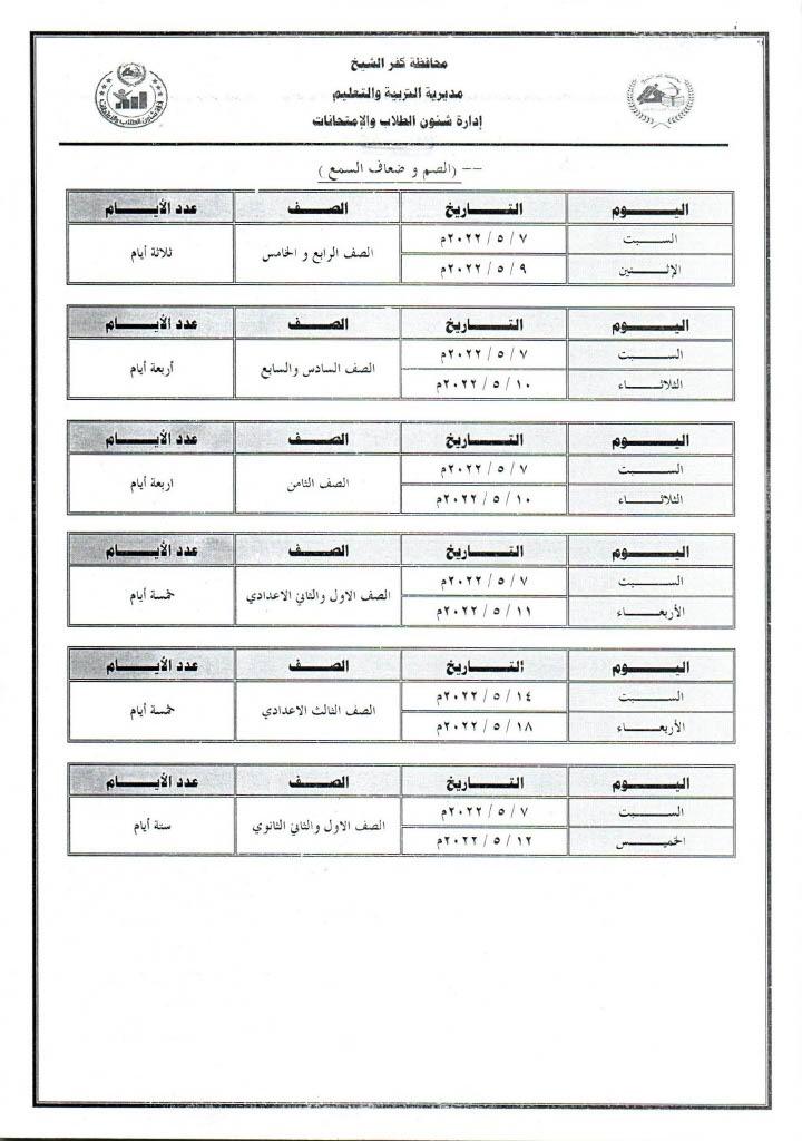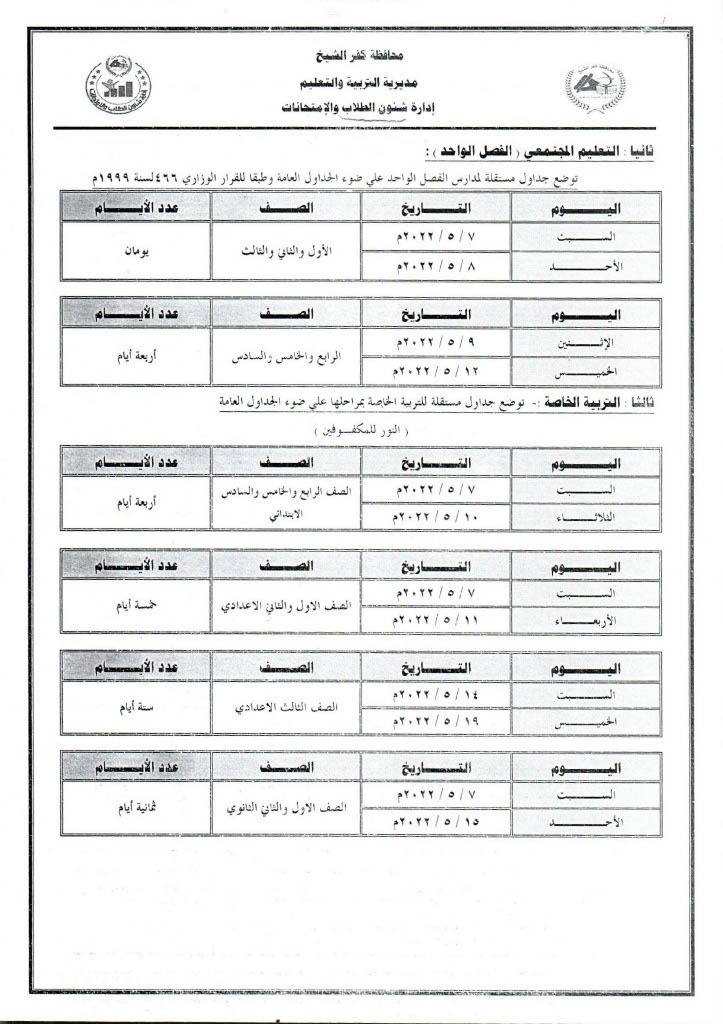 أعلن اللواء جمال نور الدين، محافظ كفر الشيخ، مواعيد امتحانات الفصل الدراسي الثاني للعام الدراسي 2022/2021 م، المقترحة لصفوف المرحلة الابتدائية والإعدادية عام مهني، تربية خاصة، تعليم مجتمعي، والتعليم الثانوي العام والفني.