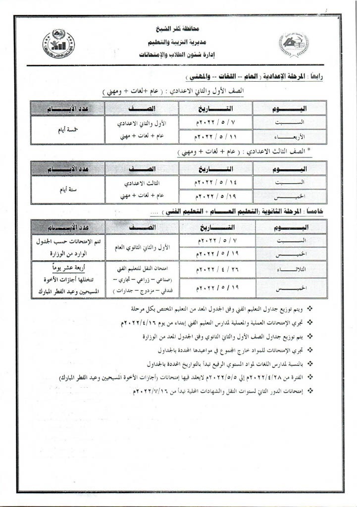 في حين أن امتحانات الصف الأول والثاني الإعدادي لمدة 5 أيام؛ تبدأ 7 مايو حتى 11 مايو المقبل، والصف الثالث الإعدادي عام ولغات ومهني لمدة 6 أيام؛ تبدأ 14 مايو حتى 19 مايو المقبل، أما المرحلة الثانوية عام وفني، الصف الأول والثاني الثانوي العام؛ تبدأ الامتحانات 7 مايو المقبل حتى 19 مايو المقبل، وتتم الامتحانات حسب الجدول الوارد من الوزارة، أما امتحانات النقل للتعليم الفني صناعي، زراعي، تجاري، فندقي، مزدوج، جداريات من الثلاثاء 26 أبريل الجاري حتى 19 مايو المقبل، لمدة 14 يوما؛ تتخللها أجازه الأخوة المسيحيين وعيد الفطر المبارك.
