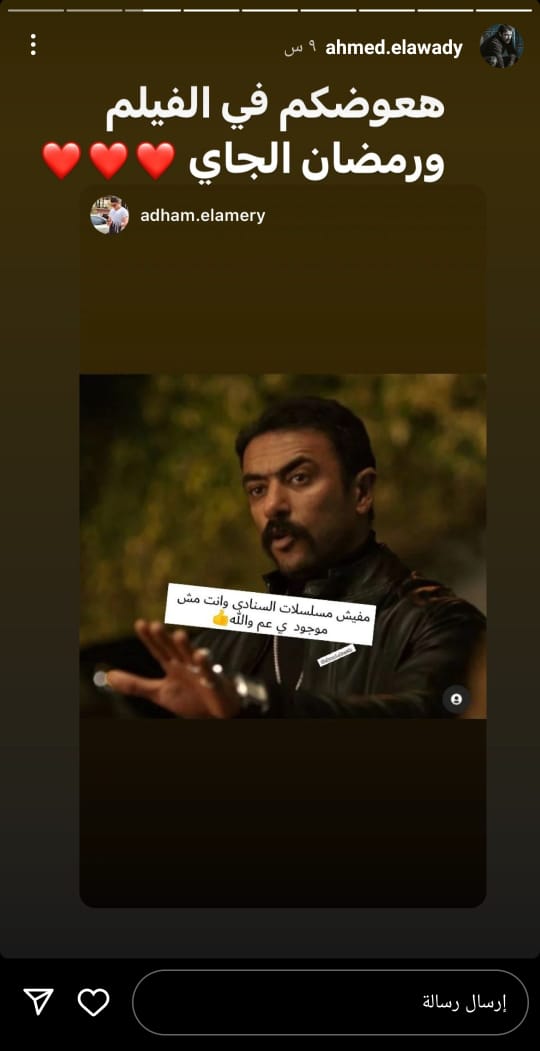وشارك العوضي ستوري لأحد متابعيه، عبر حسابه الشخصي بموقع تبادل الصور والفيديوهات القصيرة انستجرام، قال فيه: مفيش رمضان السنادي وأنت مش موجود يا عم والله، ليرد عليه الفنان قائلًا: هعوضكم في الفيلم ورمضان الجاي.
