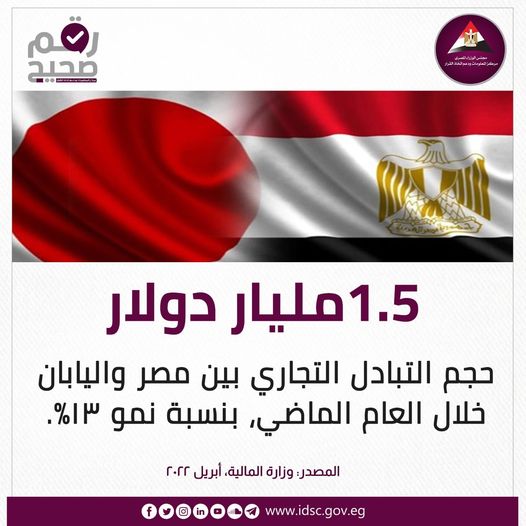 أعلن مركز المعلومات ودعم اتخاذ القرار بمجلس الوزراء أمس، ارتفاع حجم التبادل التجاري بين مصر واليابان خلال 2021 إلى 1.5 مليار دولار، بنسبة زيادة تصل إلى 13%، إذ زاد حجم التبادل التجاري بين البلدين خلال الـ 20 عاما المنصرمين، من 578 مليون دولار عام 2001، إلى مليار ونصف دولار العام الماضي، حيث يجمع بين مصر واليابان علاقات ودية على مستوى عدة مجالات، وبدأت هذه العلاقات من أول بعثة ساموراي لمصر عام 1862، فاليابان تنظر لمصر باعتبارها محور العلاقات الدبلوماسية مع دول المنطقة، ودولة مهمة لاستقرارا منطقة الشرق الأوسط، وذلك حسب تصريح سفارة اليابان في جمهورية مصر العربية، لذلك ظل حجم الاستثمار والتبادل التجاري ينمو بين البلدين خلال الأعوام السابقة، نتيجة التجارة البينية المستمرة بينهما.