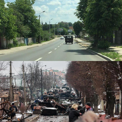 وأعلنت أوكرانيا يوم 1 إبريل انسحاب الروس من المدينة، ليدخل بعد ذلك العسكريون والصحفيون، ويشاهدوا مناظر فظيعة، من القتلى المدنيين سواء الصغار والكبار سنًا في الطريق إلى المدينة، كما قتل الجنود الروس أولئك الذين استطاعوا المقاومة، أي الرجال الذين تتراوح أعمارهم بين 18 و60 عامًا، معظمهم مقيدو الأيدي وتم إطلاق النار على رؤوسهم.