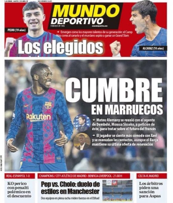 قالت موندو ديبورتيفو في غلافها اليوم، إن هناك اجتماعًا في المغرب لحسم مستقبل ديمبلي في الفترة المقبلة، وسلطت الصحيفة على لقاء إدارة برشلونة مع وكيل أعمال ديمبلي، وأفادت الصحيفة أن ديمبلي يشعر براحة أكبر مع تشافي، وتم استئناف الاتصالات، على الرغم من احتفاظ برشلونة بعرض التجديد الأخير.