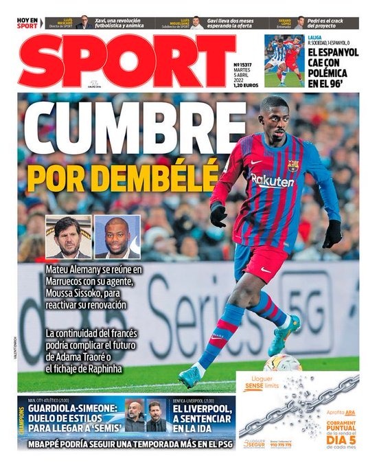 تصدر الفرنسي عثماني ديمبلي لاعب فريق برشلونة غلاف صحيفة سبورت لعدد اليوم، حيث عنونت بـ اجتماع من أجل ديمبلي، وقالت الصحيفة إن ماتيو أليماني يلتقي في المغرب مع وكيل أعماله موسى سيسوكو، لإعادة تنشيط تجديده.