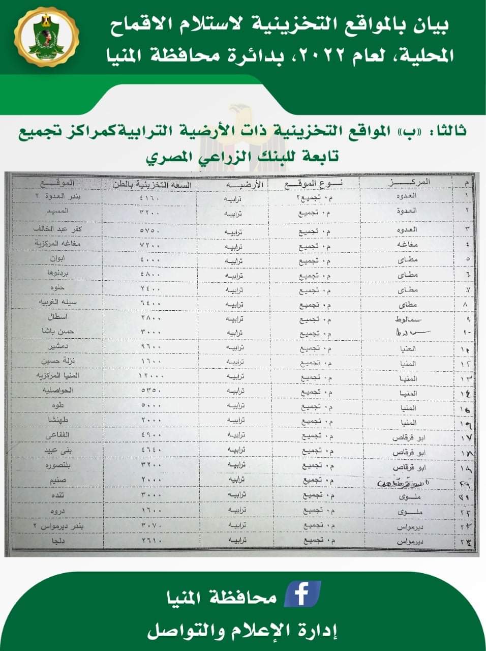 أوضح المحافظ، أن المواقع مُوزعة كالتالي: 7 صوامع معدنية، 4 تابعة للشركة المصرية القابضة للصوامع، 2 للمطاحن، 1 قطاع خاص، 5 هناجر تابعة للبنك الزراعي، 3 شون أسمنتية تابعة للبنك الزراعي، 3 مستودعات ومخازن تابعة للبنك الزراعي، 26 مركز للتجميع مُوزعة كالتالي: 24 موقع للبنك الزراعي، و2 موقع للمطاحن.