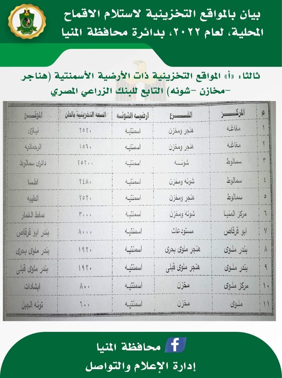 أعلن اللواء أسامة القاضي، محافظ المنيا، فتح 44 موقع تخزيني بدائرة المحافظة، لاستقبال الأقماح المحلية للعام 2022، وذلك في إطار تنفيذ خطة المحافظة الشاملة، لإحكام السيطرة والرقابة على أعمال توريد محصول القمح للصوامع والشون المخصصة لهذا الغرض.