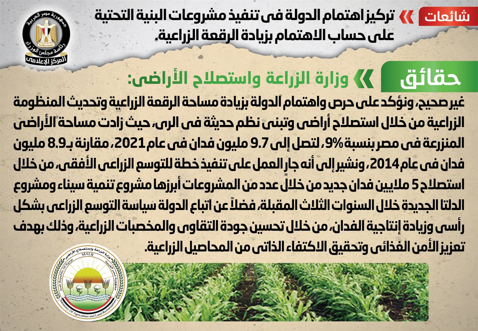 وتواصل المركز الإعلامي لمجلس الوزراء، مع وزارة الزراعة واستصلاح الأراضي، وأكدت أنه لا صحة لتركيز اهتمام الدولة في تنفيذ مشروعات البنية التحتية، على حساب الاهتمام بزيادة الرقعة الزراعية، مُؤكدةً حرص واهتمام الدولة بزيادة مساحة الرقعة الزراعية وتحديث المنظومة الزراعية من خلال استصلاح أراضي وتبنى نظم حديثة في الري، حيث زادت مساحة الأراضي المنزرعة في مصر بنسبة 9%، لتصل إلى 9.7 مليون فدان في عام 2021، مقارنة بـ 8.9 مليون فدان في عام 2014.