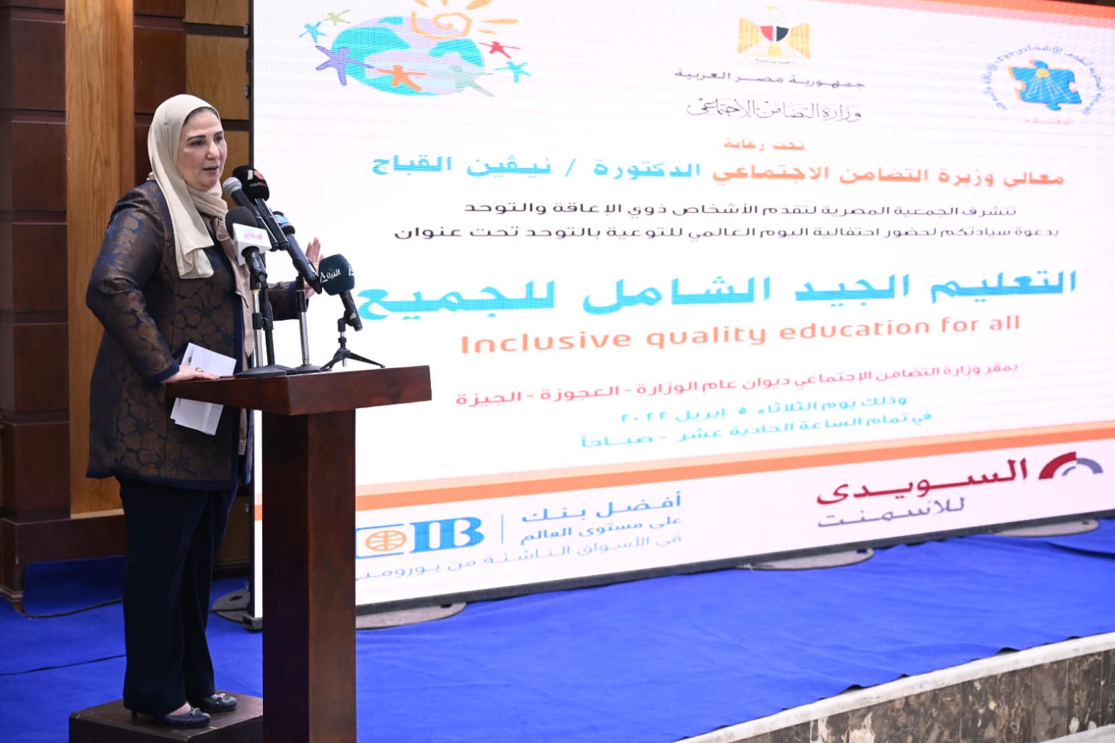 وأكدت وزيرة التضامن الاجتماعي أن طيف التوحد يعد من أصعب أنواع الإعاقة لأنه ليس ظاهرًا، وقد يتأخر اكتشافه، مشيرة إلى أهمية الاهتمام مجتمعيًا وإعلاميًا بشكل أكبر بالأطفال ذوي الإعاقة عمومًا، وضرورة وحتمية التوعية بطبيعة الإصابة وطرق التعامل الأفضل مع كل إعاقة، وأهمية الاكتشاف والتدخل المبكر لتحسين فرص تطورهم ومساعدتهم للوصل لأقصى طاقاتهم، وتثقيف الآباء والأمهات حول أفضل وسائل التعامل مع الطفل المعاق.