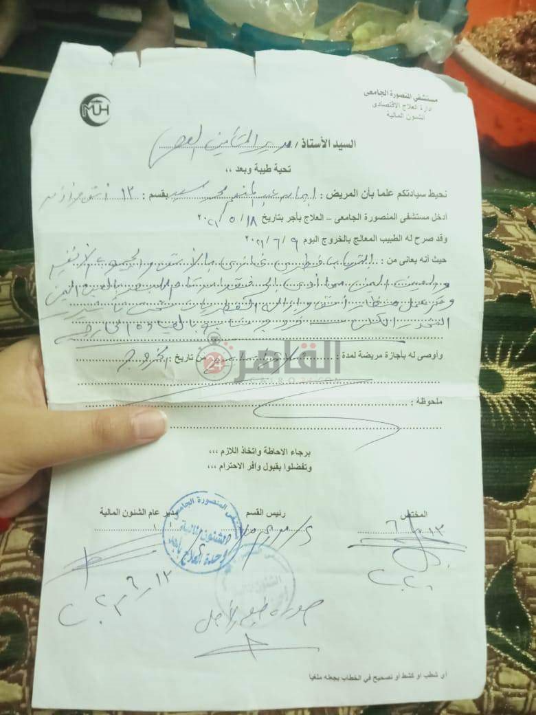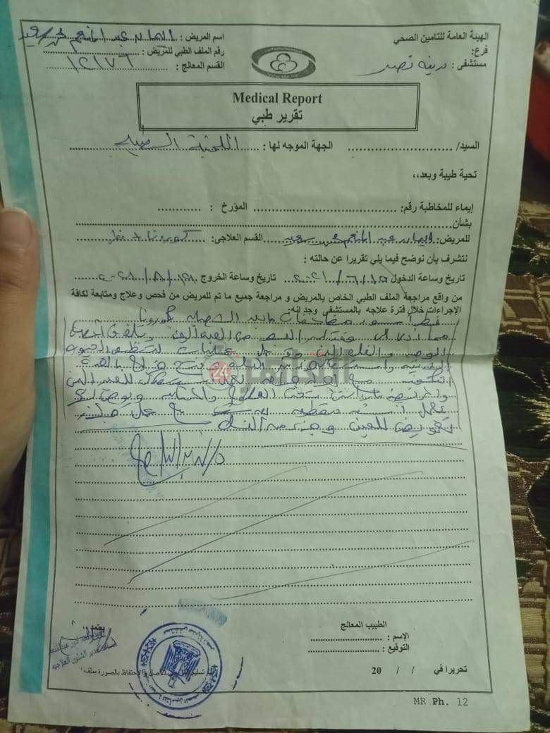 بعد خروجها من مستشفى المنصورة الجامعي، أشارت عليها مديرتها بمجمع طلاب المحلة الذهاب إلى مستشفى مدينة نصر للتأمين الصحي، بعد التنسيق معهم؛ لتلقي العلاج ورعاية صحية أفضل.
