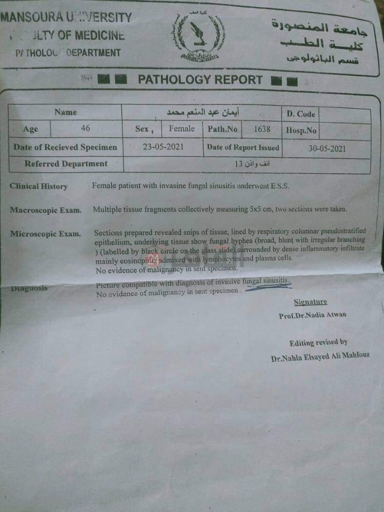 طلب رئيس قسم الأنف والأذن بمستشفى المنصورة من الطبيب عمل اختبار على عينها اليمنى الملتهبة، وعليه تقرر نقلها فورًا إلى طوارئ المنصورة الجامعي؛ لخطورة حالتها الصحية؛ وهناك أكدت التحاليل المعملية بالمستشفى حتمية الإصابة بمرض الفطر الأسود.