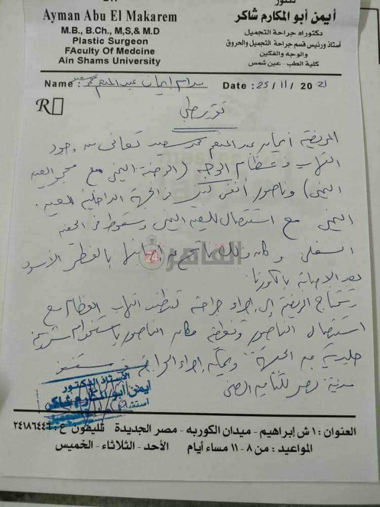 وخلال شهر ونصف في مستشفى المنصورة، أجرت إيمان عمليات جراحية لتنظيف الجيوب الأنفية فقط، دون التطرق لمعالجة الالتهاب في العين اليمنى.