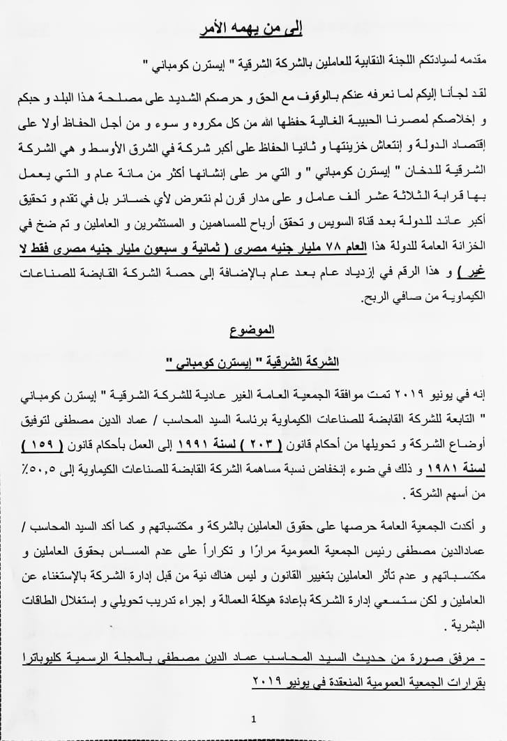 أرسلت اللجنة النقابية للعاملين في الشركة الشرقية للدخان إيسترن كومباني، مذكرة، إلى وزيرة التجارة والصناعة نيفين جامع، تخاطبها بعدد من الأزمات في الشركة، وتشتكي مجلس الإدارة الحالي.