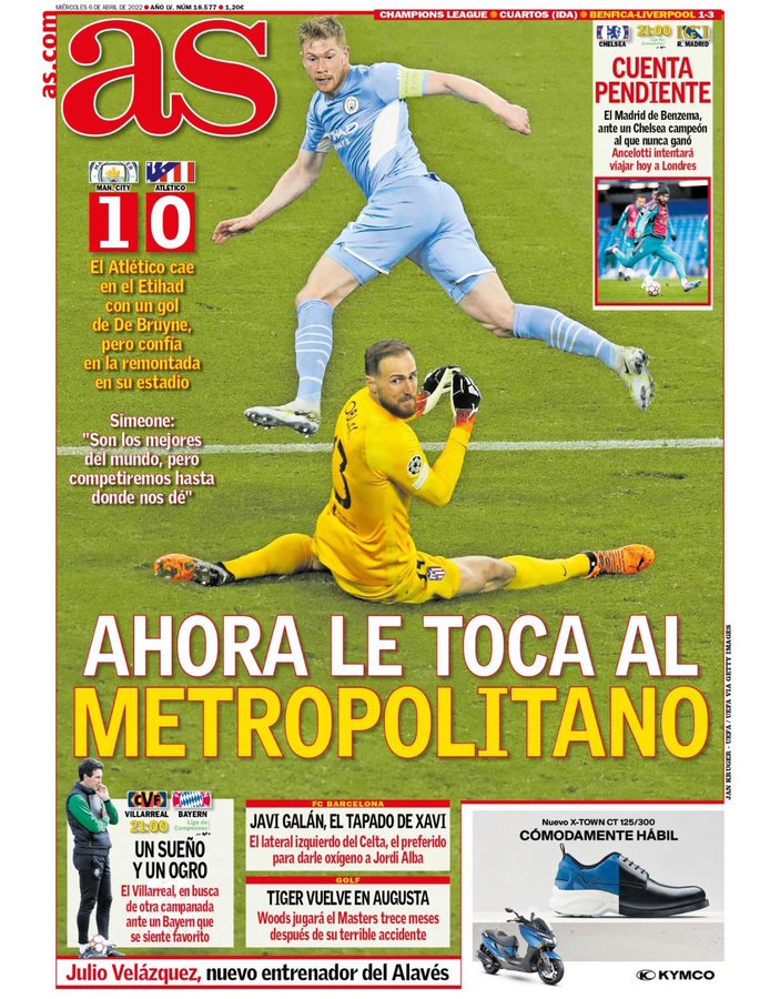 عنونت جارديان في غلافها الصادر عن عدد اليوم، بفرصة مانشستر سيتي، وقالت إن دي بروين واصل التألق ضد أتلتيكو مدريد، وقاد السكاي بلو نحو التقدم في ذهاب ربع نهائي التشامبيونزليج.