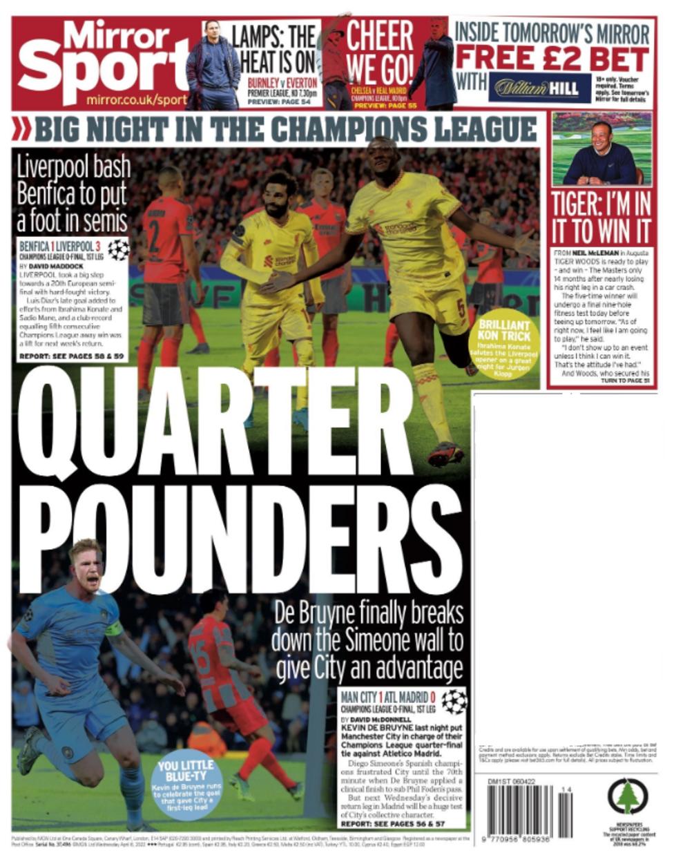 قالت ميرور في غلافها، إن ليلة أمس كانت كبيرة في دوري أبطال أوروبا، وذلك للفريقين الإنجليزيين، حيث حقق ليفربول وكذلك مانشستر سيتي التفوق في مباراة الذهاب من دور ربع النهائي.