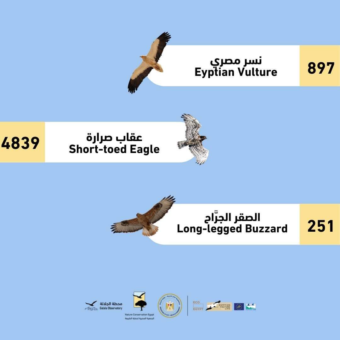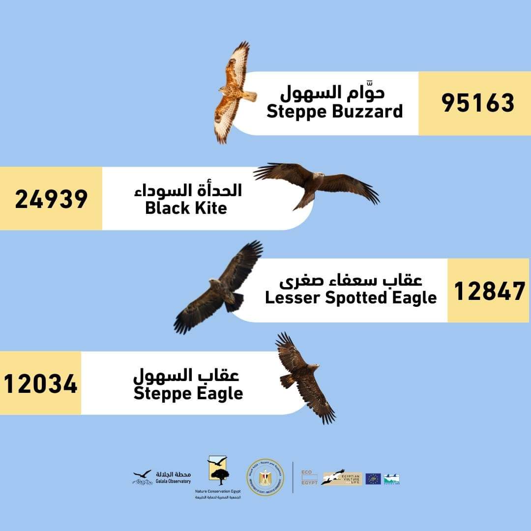 وقد رصد مراقبو الطيور في محطة جبل الجلالة 95163 طائر من نوع حوام السهول، و24939 طائر من الحدأة السوداء، ووصل عدد طيور العقبان وتحديدا السعفاء الصغرى إلى 12847 طائر، و12034 من عقاب السهول.