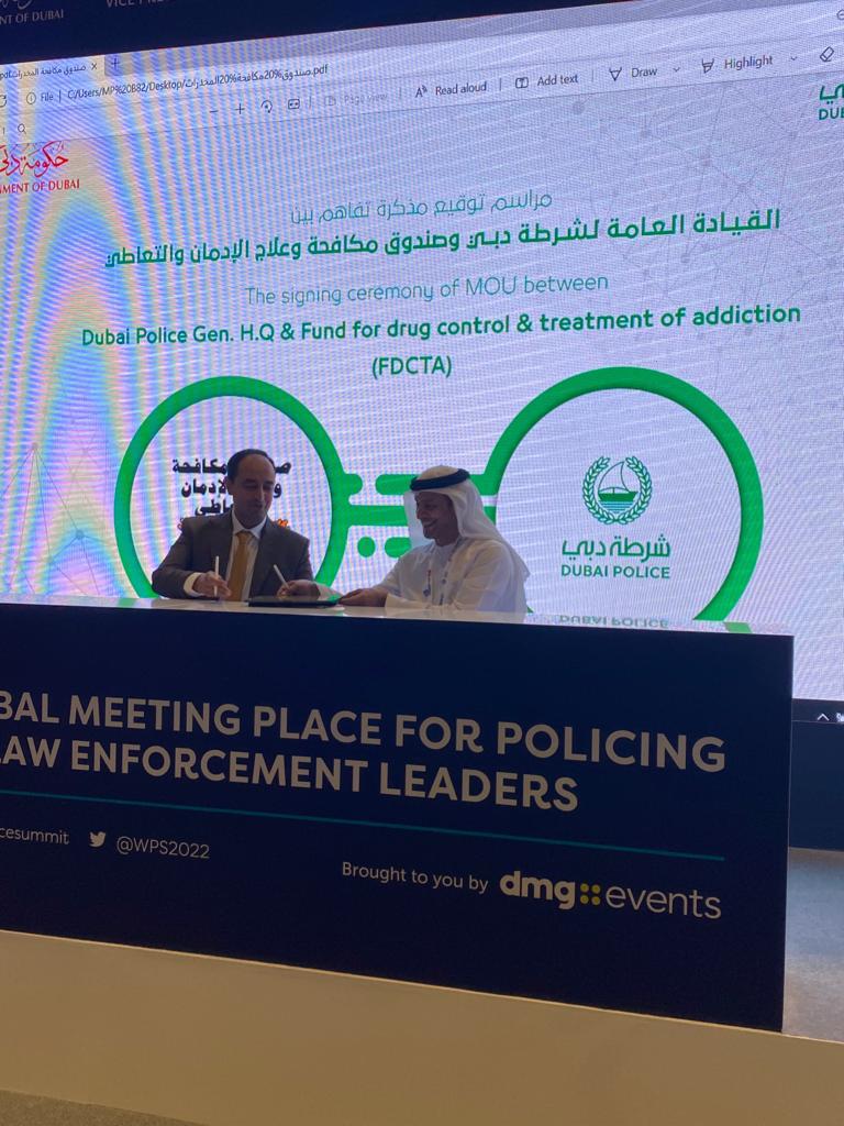 ووقع بروتوكول التعاون كل من عمرو عثمان، مساعد وزير التضامن الاجتماعي ومدير صندوق مكافحة وعلاج الإدمان والتعاطي في جمهورية مصر العربية، والعميد عيد محمد ثاني حارب، مدير الإدارة العامة لمكافحة المخدرات، عن اللواء الخبير خليل إبراهيم المنصوري، مساعد القائد العام لشؤون البحث الجنائي في القيادة العامة لشرطة دبي.