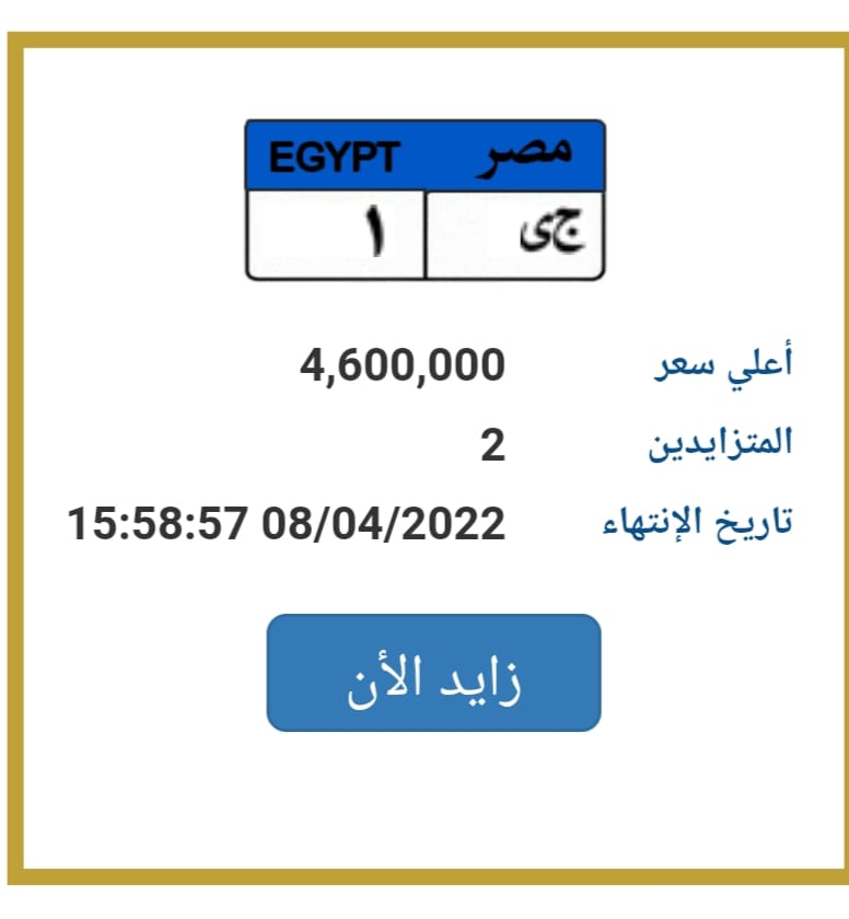 وينتهي التزايد على لوحة مرور "ج م 1" في تاريخ أقصاه 8 من شهر أبريل الجاري، في تمام الساعة الثالثة و58 دقيقة عصرًا.