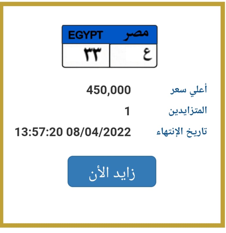 بدأ التزايد على لوحة مرور "ع 33" من 450 ألف جنيه، علمًا أن عدد المتزايدين عليها شخص واحد فقط، وينتهي التزايد عليها في تاريخ 8 من أبريل الجاري.