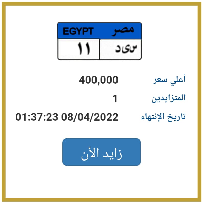فيما يبدأ التزايد على لوحة "س ي د 11" من سعر 400 ألف جنيه مصري، وينتهي عليها التزايد في تاريخ 8 أبريل الجاري.