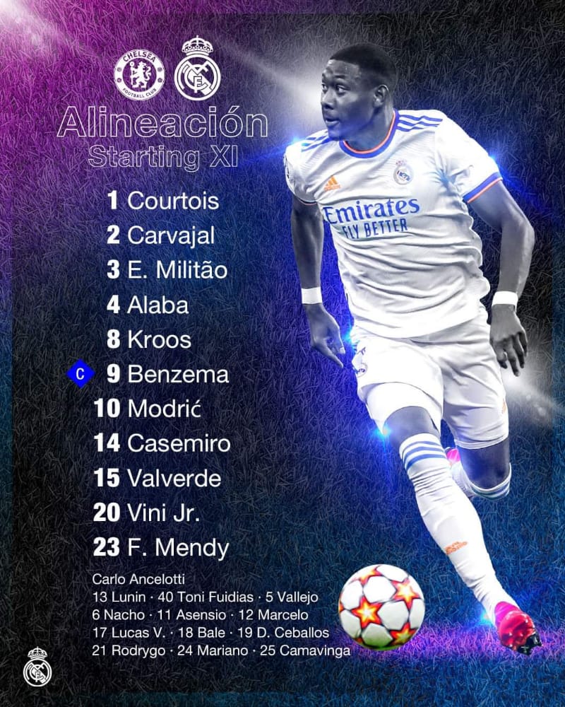 وجاء التشكيل الرسمي الذي سوف يخوض به ريال مدريد مباراة تشيلسي كما يلي:
