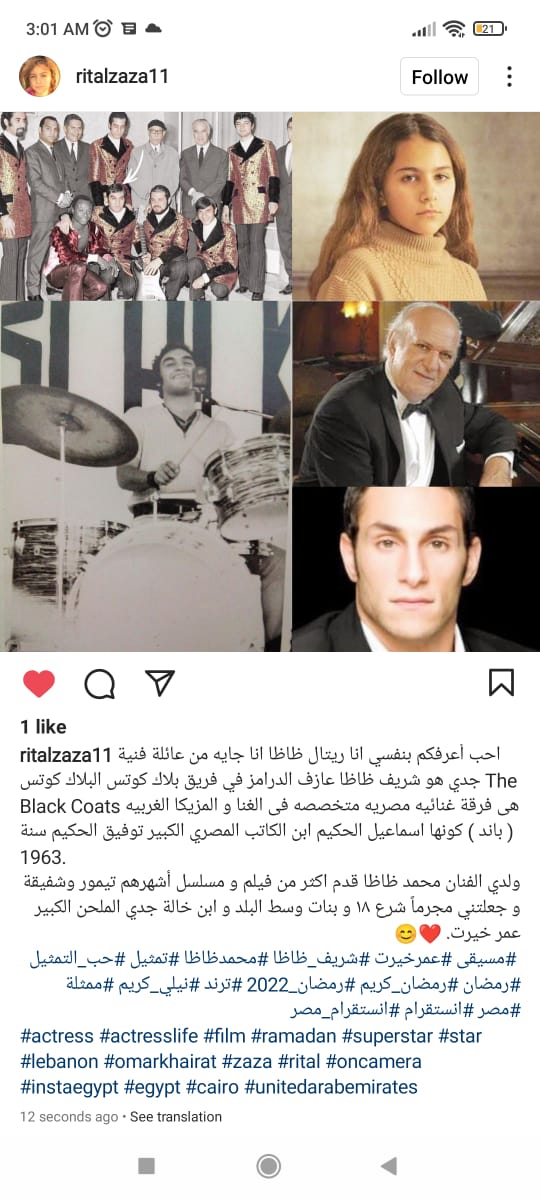 وتابعت ريتال ظاظا: ولدي الفنان محمد ظاظا، قدم أكثر من فيلم ومسلسل أشهرهم تيمور وشفيقة، وجعلتني مجرما، شارع 18، بنات وسط البلد، وابن خالة جدي الملحن الكبير عمر خيرت.