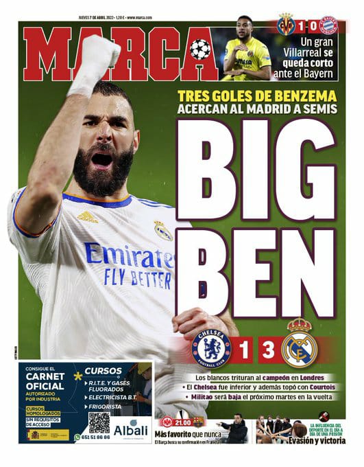 عنونت ماركا في غلافها بـ بيج بين، حيث قالت إن ثلاثية بنزيما تُقرب ريال مدريد من نصف النهائي، حيث أن الفريق الأبيض؛ أهان البطل في لندن.
