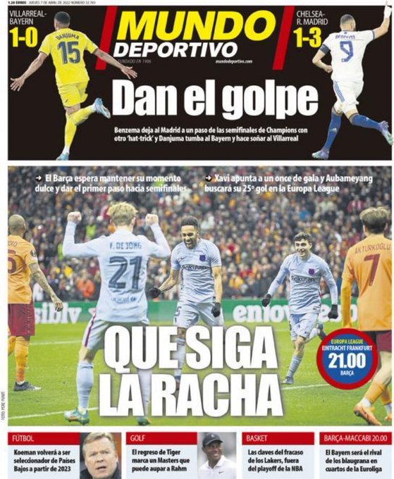 وتصدر لاعبو فريق برشلونة؛ غلاف الصحيفة تحت عنوان التحدي الأوروبي، حيث قالت سبور، إن برشلونة يريد أن يخطو خطوة إلى الدور نصف النهائي من الدوري الأوروبي ضد خصم مُعقد.