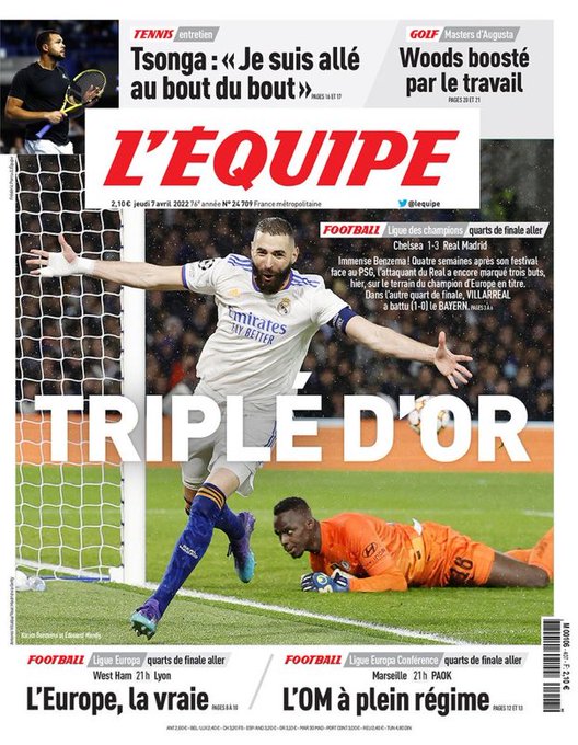 تصدر كريم بنزيما، الهداف الفرنسي، وقائد ريال مدريد؛ غلاف صحيفة ليكيب لعدد اليوم، حيث عنونت بـ تريبل دور، وذلك في إشارة مزدوجة لهاتريك بنزيما، ومنافسته على البالون دور لهذا العام.