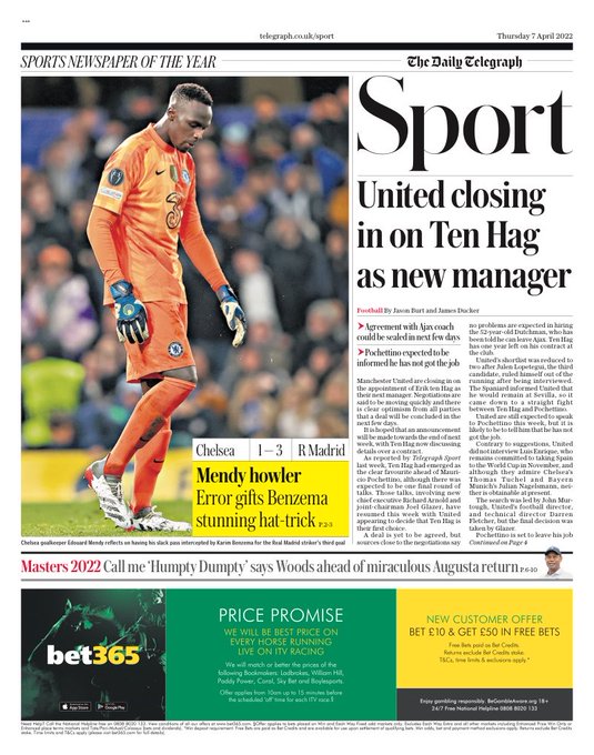 يرصد القاهرة 24 لمتابعيه جولة في الصحف العالمية، اليوم الخميس الموافق 7 أبريل، والتي شهدت بعض الأنباء الهامة على صعيد الدوريات الأوروبية الكبرى، مع فوز ريال مدريد بثلاثية على تشيلسي في دوري أبطال أوروبا أمس.