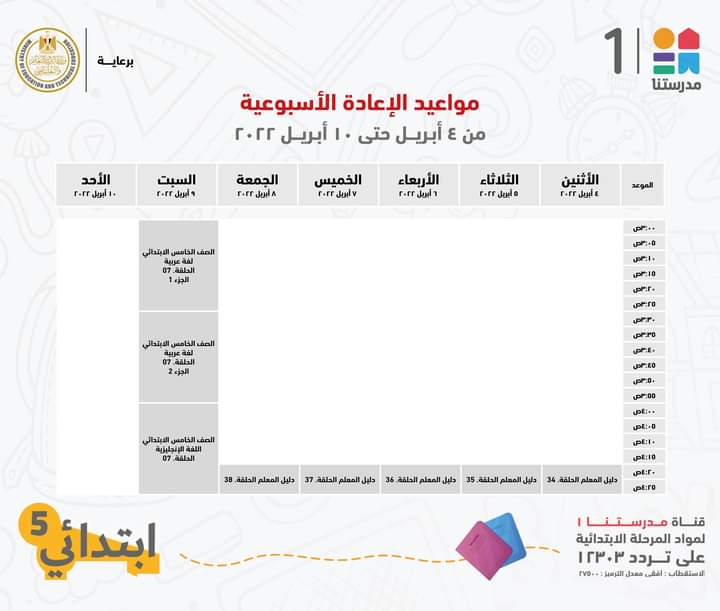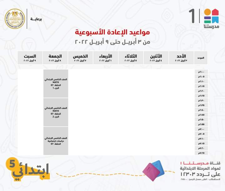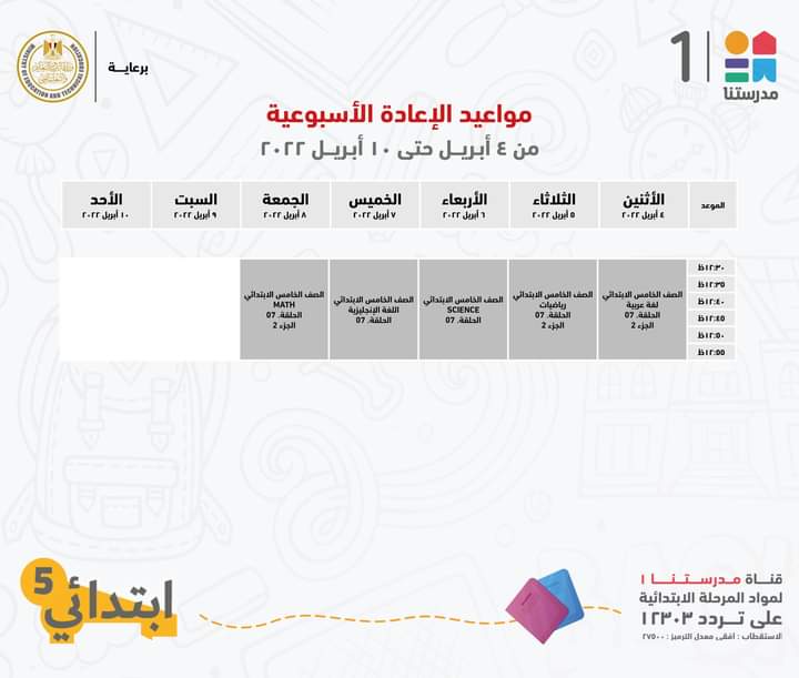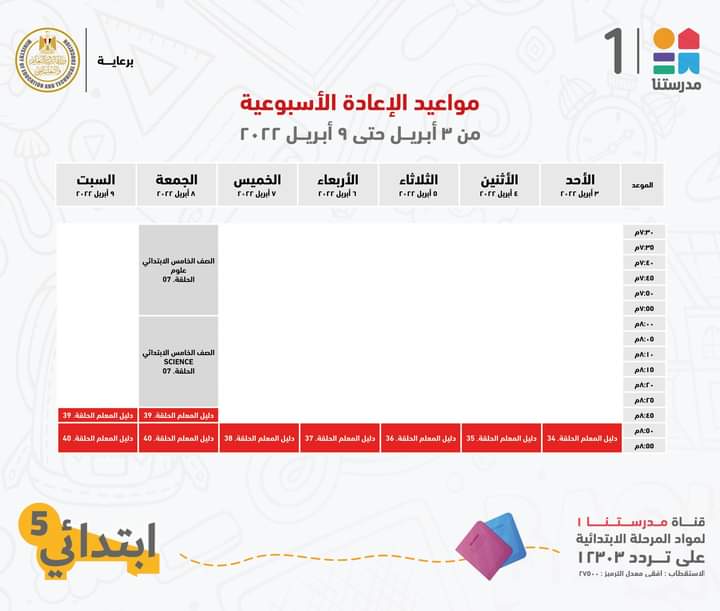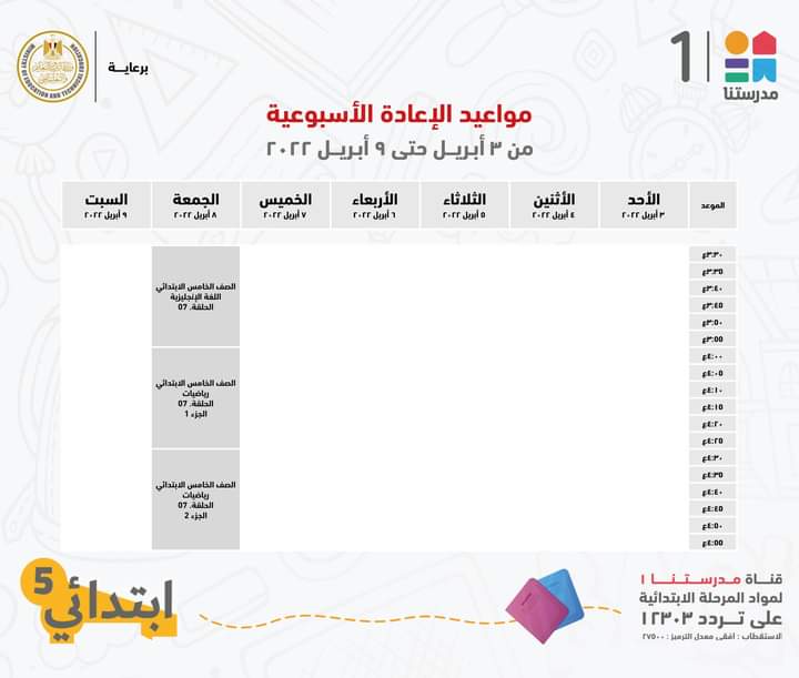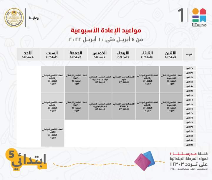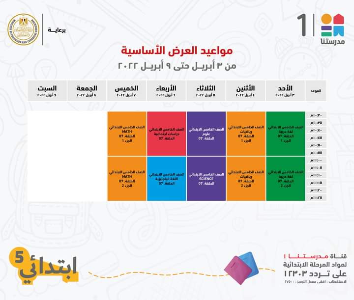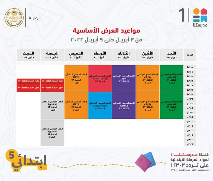 أعلنت قناة مدرستنا1، التابعة لوزارة التربية والتعليم والتعليم الفني، جدول مواعيد عرض البرامج التعليمية الخاص بطلاب الصف الخامس الابتدائي لهذا الأسبوع مع الإعادة.