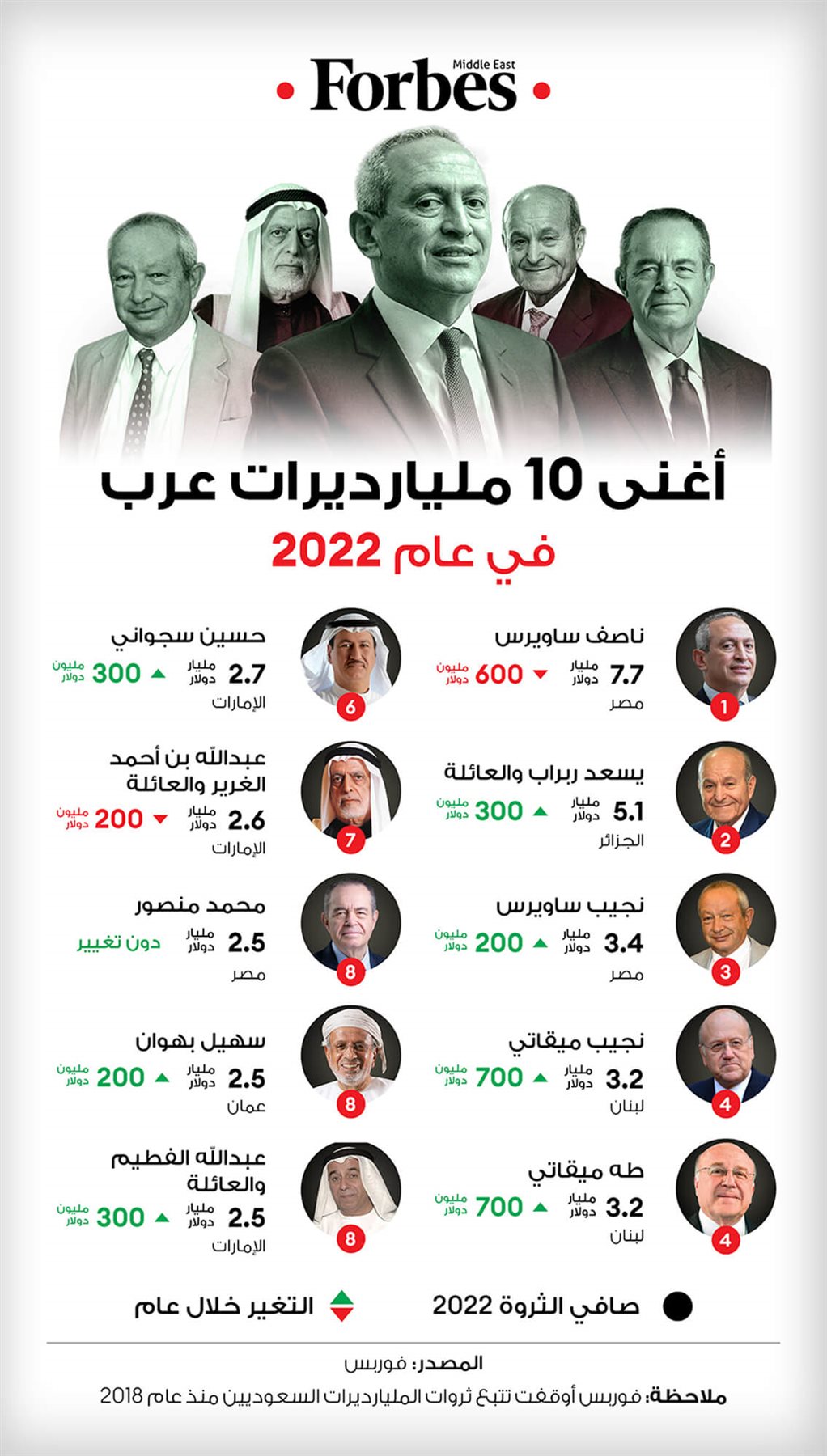 تصدر ناصف ساويرس، رجل الأعمال المصري الشهير، قائمة مجلة فوربس العالمية عن قائمة أغنياء العرب 2022، وتضمنت 6 مصريين، 5 منهم من عائلتي ساويرس ومنصور.