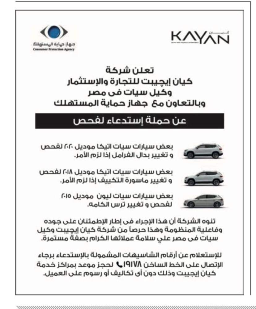 وتأتي حملة استدعاء سيارات سيات في مصر، في إطار حرص جهاز حماية المستهلك على دعم المستهلكين.