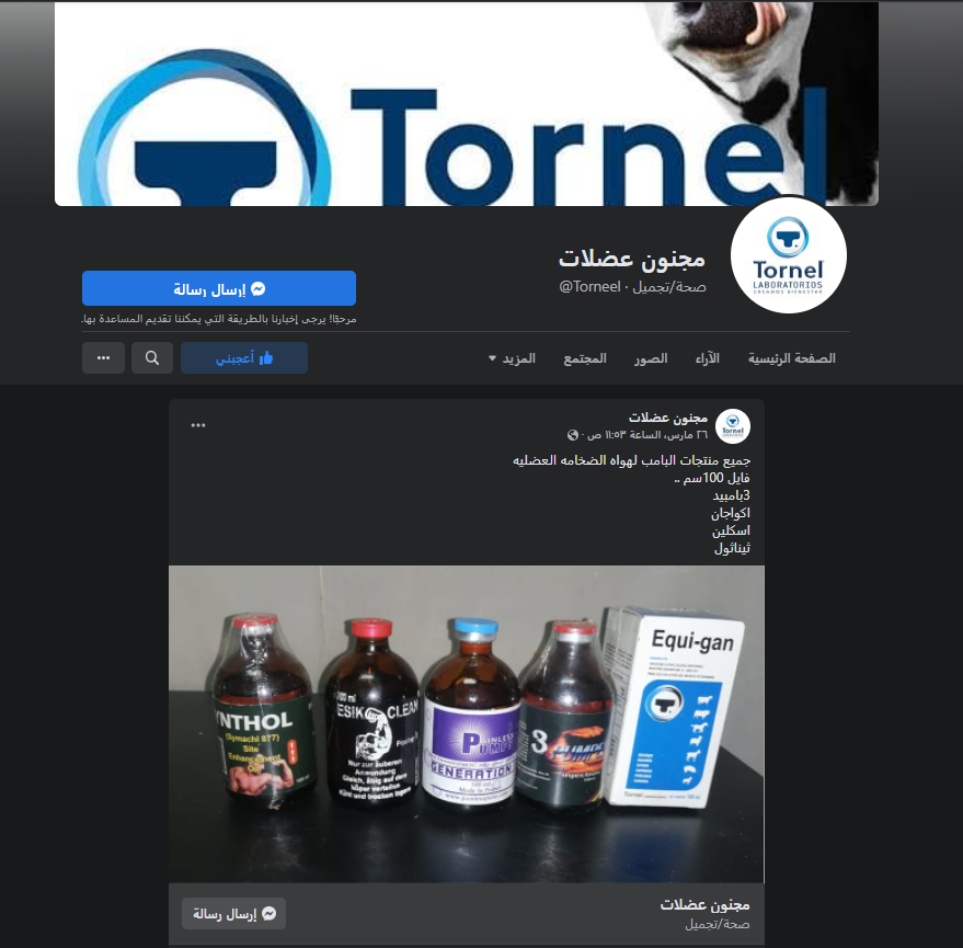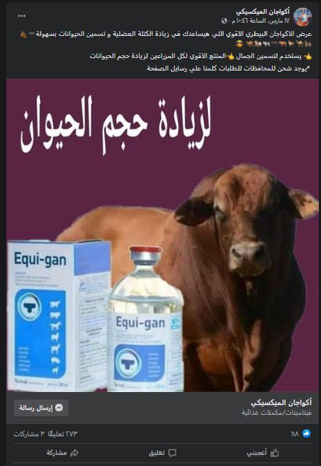 بخلاف الترويج لاستخدامات العقار في تسمين الماشية، تروج صفحات وجروبات فيسبوك لاستخدام العقار في تكوين عضلات الإنسان، ورصدنا مجموعة كبيرة من البوستات التي تروج لهذا العقار، والتي تبيعه بسعر يتراوح بين 600 و800 جنيه للعبوة الواحدة.