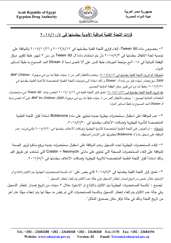 وقررت اللجنة العلمية المتخصصة للأدوية البيطرية وإضافات الأعلاف بجلستها في 30/7/2018 عدم الموافقة على تسجيل المادة لخطورتها على الإنسان المستهلك.