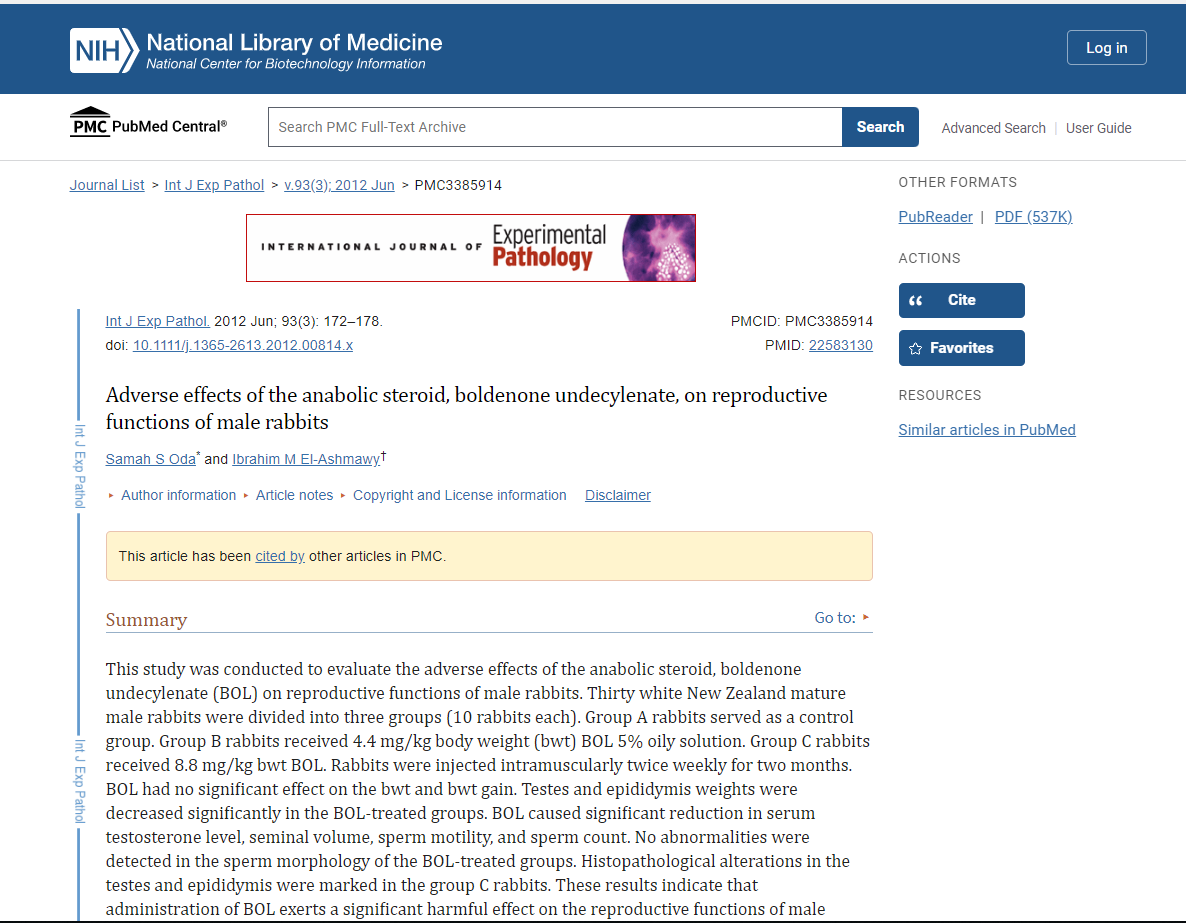 وأظهرت دراسة علمية نشرت في دورية national library of medicine، يونيو 2012، أن العقار له تأثير ضار على الوظائف الإنجابية للذكور، ورصدت الدراسة الآثار العكسية للستيرويد المنشطة بولدينون وندسيلنات (BOL) على الوظائف التناسلية لذكور الأرانب.