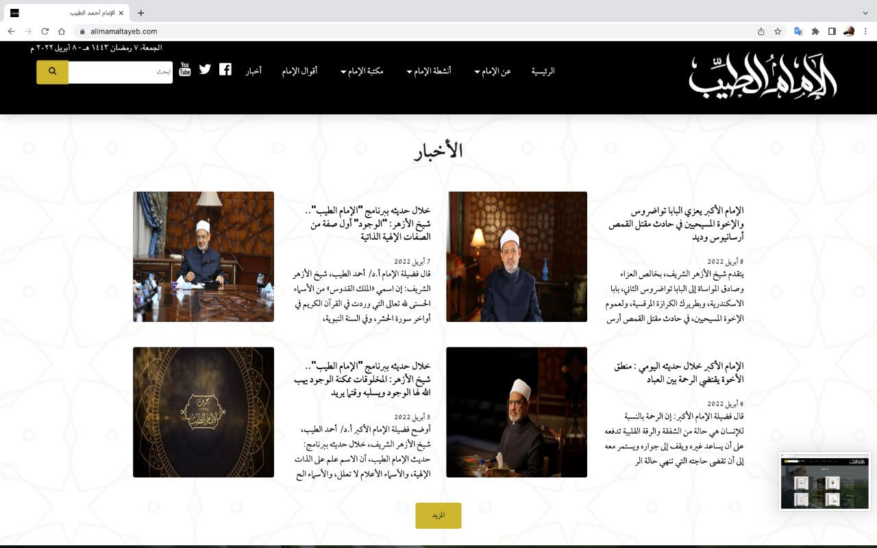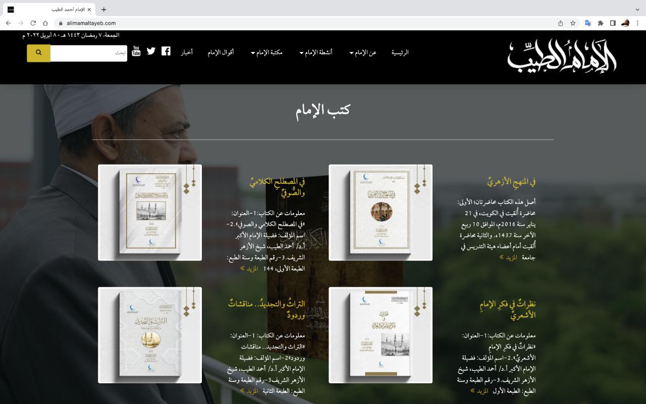 دشُن اليوم الجمعة 7 رمضان 1443هـ الموافق 8 أبريل 2022م، الموقع الرسمي للإمام الأكبر الدكتور أحمد الطيب، شيخ الأزهر الشريف، رئيس مجلس حكماء المسلمين، لخدمة الباحثين والدارسين والجمهور وإتاحة كل جهود الإمام الطيب ومسيرته موثقة بالنص والصوت والصورة، وتسهيل الوصول إلى كل ما يخص الإمام الطيب في موقع رسمي، وتم الإعلان عن إطلاق الموقع اليوم خلال الاحتفال السنوي للجامع الأزهر بمناسبة مرور 1082 عامًا على افتتاح الجامع والصلاة فيه.