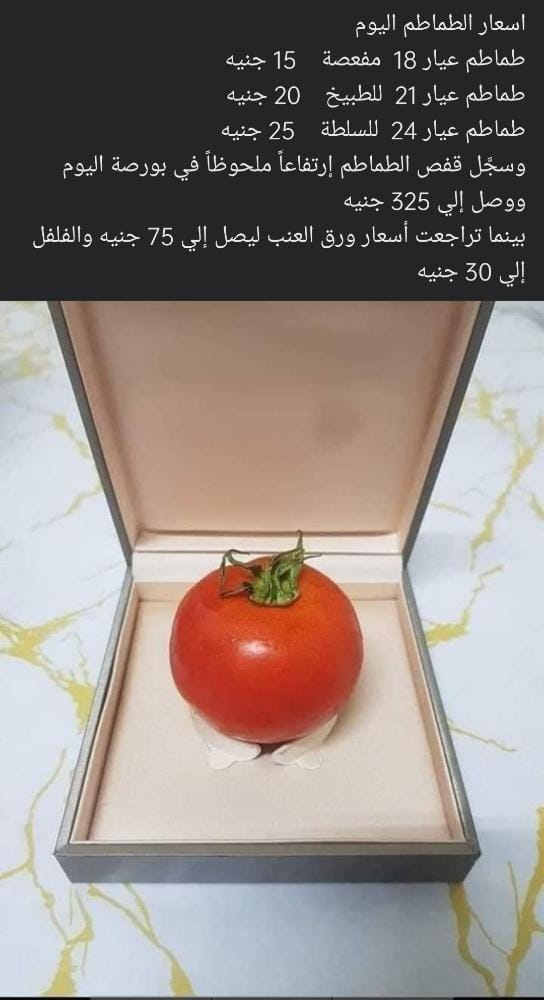 تصدرت الطماطم تريند موقع التواصل الاجتماعي فيسبوك، نتيجة ارتفاع أسعارها التي تخطت الـ 20 جنيه للكيلوجرام، مما أدى إلى غضب كبير بين رواد مواقع التواصل الاجتماعي، وسرعان ما انتشرت التعليقات الساخرة على الطماطم، مع مقارنتها بأسعار الذهب.